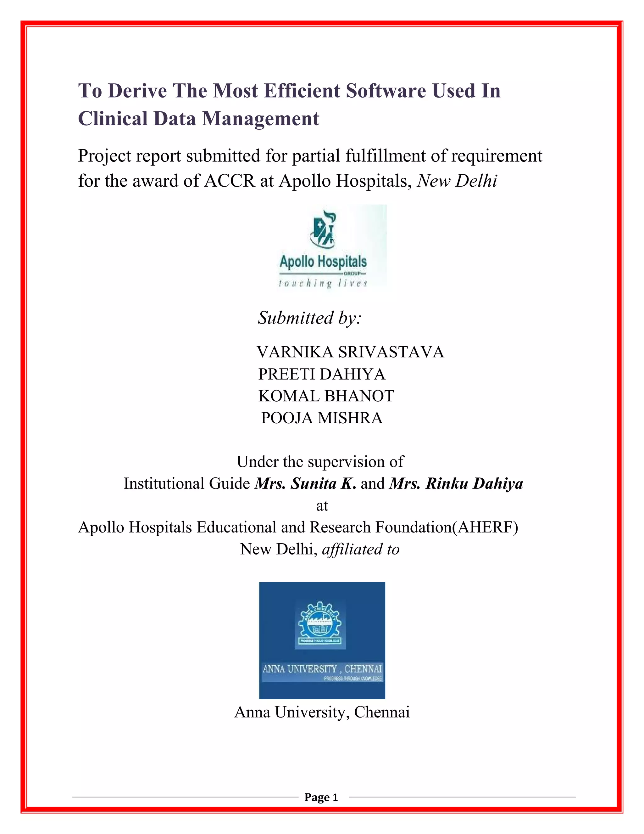 This document provides an overview of clinical data management processes. It discusses the goals of clinical data management which are to provide high-quality, accurate data through processes like case report form design, data entry, validation, and coding. It describes some commonly used clinical data management software and standards/guidelines like 21 CFR Part 11 and SCDM's Good Clinical Data Management Practices. The document is a project report submitted by students to fulfill requirements for a degree at Apollo Hospitals, New Delhi.