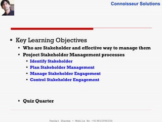 This document discusses project stakeholder management. It provides an overview of identifying stakeholders, planning stakeholder management, and managing stakeholder engagement. Key points covered include identifying stakeholders using tools like stakeholder analysis, developing a stakeholder register output. It also discusses planning stakeholder management, including developing a stakeholder management plan using inputs like the stakeholder register and meetings to define engagement levels.