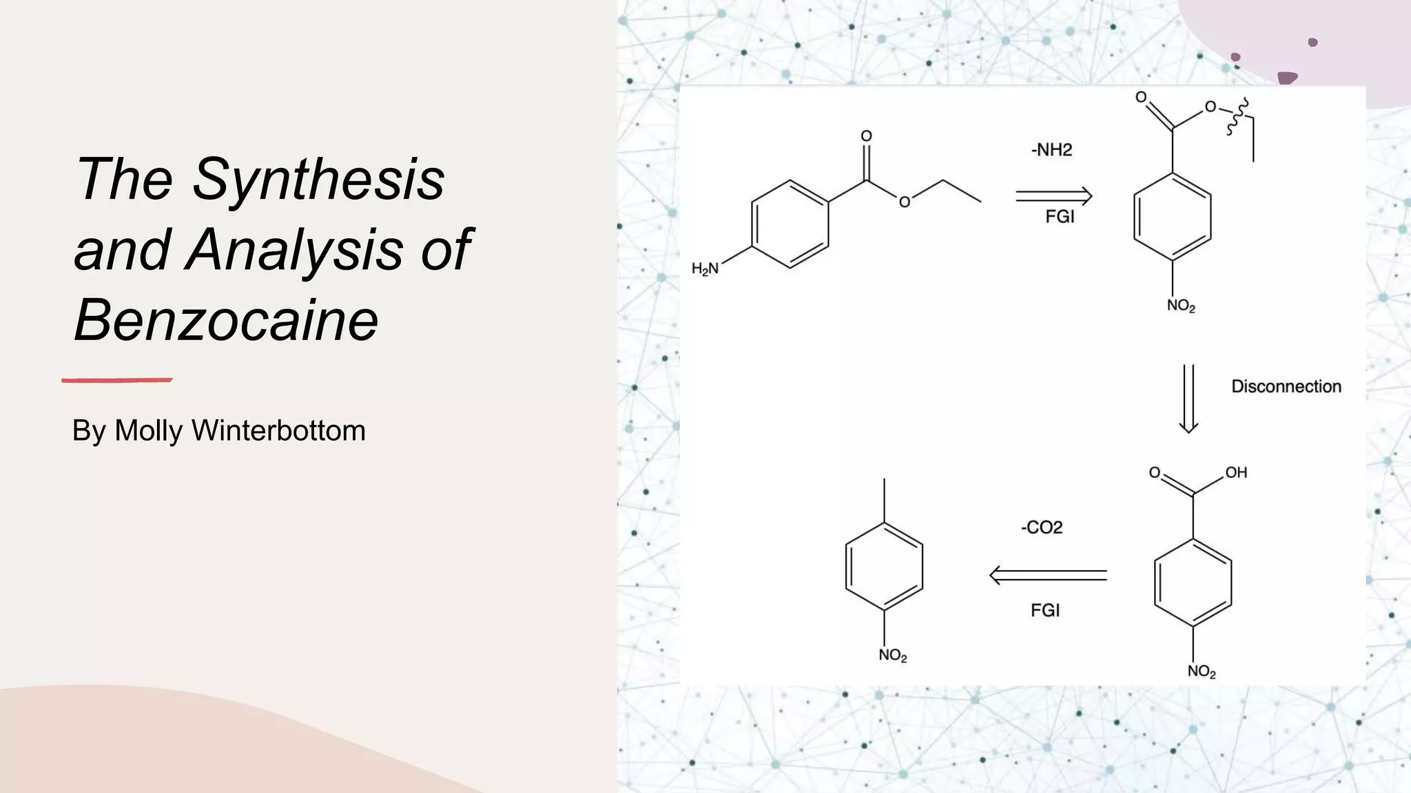 The document summarizes Molly Winterbottom's experiment to synthesize benzocaine through a three-step process from nitrotoluene. The first step was oxidizing nitrotoluene to form nitrobenzoic acid. The second step was a Fischer esterification of nitrobenzoic acid to form ethyl 4-nitrobenzoate. The third step reduced the nitro group to an amino group to form the final product, ethyl 4-aminobenzoate (benzocaine). TLC plates and IR spectroscopy confirmed the products of each step. Two analogs were also synthesized by modifying the second and third steps.