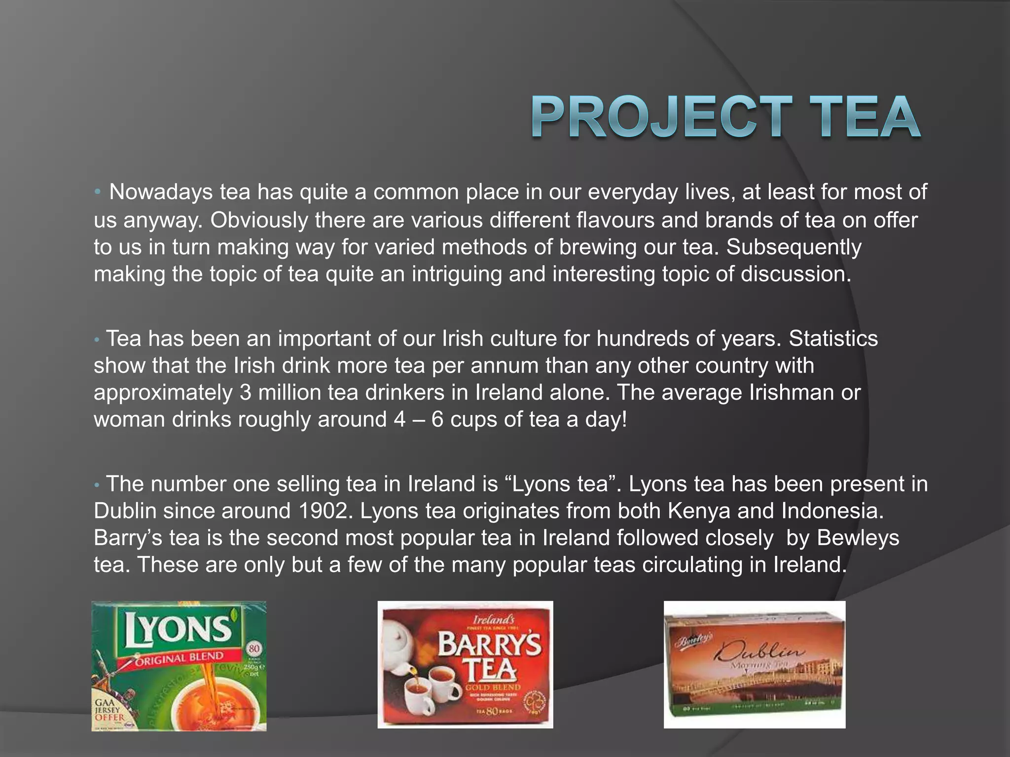 This document discusses tea and tea making in Ireland. It notes that tea is very popular in Ireland, with the average person drinking 4-6 cups per day. The most popular tea brand in Ireland is Lyons Tea. It then provides instructions for making loose leaf tea using loose tea leaves and a teapot. Finally, it describes several popular tea blends, including English Breakfast, Darjeeling, and Earl Grey teas.