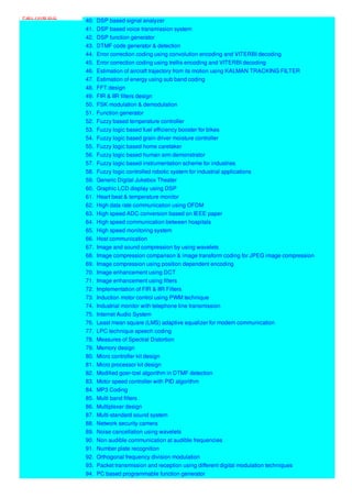 This document provides a list of over 300 project ideas in the areas of DSP projects, embedded projects, and microcontroller projects. It includes brief 1-2 sentence descriptions of projects related to areas like signal processing, communications, industrial control, home automation, and more. The document also provides contact information for an expert systems and solutions company in Chennai, India that may provide assistance with these types of projects.