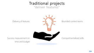 This document discusses transitioning from a traditional project-based software development model to a product-focused model. It outlines changes needed across several dimensions, including role definitions, taxonomy, culture, talent, funding models, and leadership. It then provides an example case study of transforming a bank's IT organization by starting with an experimental product team, establishing alignment between business and technology, shifting to a product taxonomy, moving to outcome-based funding, empowering teams, and focusing on cultural transformation. The goal is to transition from a "black box IT" project model to an agile, lean, product-oriented approach over 9-12 months.