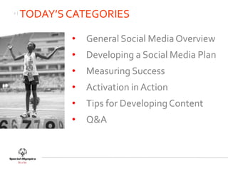 This document provides an overview of social media training for Project UNIFY. It discusses defining social media goals and selecting appropriate channels. Key topics covered include developing a social media plan by listening to audiences and determining assets, setting goals and choosing channels. The document also discusses measuring social media success and provides examples from organizations like the Humane Society and United Nations World Food Programme. It concludes with tips for platforms like Facebook and Twitter, considerations for using existing vs new accounts, timelines for engagement, and final words of advice around community building and storytelling.