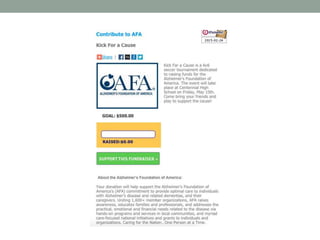 Ally Driscoll is organizing a 6v6 soccer tournament fundraiser to benefit the Alzheimer's Foundation of America. So far, she has set the date for May 15th from 4-6pm at CHS, with a fundraising goal of $500-1000 per team. She has created an online fundraising page and is speaking to local businesses about sponsoring the event. Future plans include finalizing the schedule, creating forms and advertisements, obtaining equipment and volunteers, and potentially making a website for the tournament. The event will raise money for the Alzheimer's Foundation, which aims to improve quality of life for those with dementia and their caregivers.