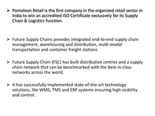 Pantaloon Retail values reducing costs through its supply chain to maximize profits. It has achieved an ISO certificate for its supply chain and logistics functions, which helps decrease costs and response times through bulk purchasing and efficient logistics. Future Supply Chains provides integrated end-to-end supply chain management for Pantaloon Retail, including distribution centers, transportation, and technology solutions to increase visibility and control over supply chain operations.
