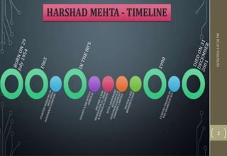 This document summarizes the Harshad Mehta stock market scam of 1992 in India. It describes how Mehta exploited loopholes in the banking system through fake transactions to raise money to artificially inflate stock prices and profit from selling shares. When the scam was exposed, it wiped out over $1 billion from the markets. Mehta was arrested and charged with multiple criminal offenses. The scam had widespread impacts, severely damaging banks involved and undermining investor confidence in the markets for years.