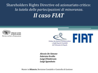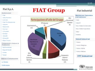 Il documento analizza la corporate governance del gruppo Fiat, evidenziando le misure di tutela per le partecipazioni di minoranza e le operazioni straordinarie, come l'acquisizione di Chrysler e la scissione delle attività aziendali. Vengono discussi gli strumenti di governance adottati e la performance finanziaria post-acquisizione, ponendo l'accento sull'aumento del debito e su indicatori economico-reddituali a confronto con un concorrente. Infine, il documento esamina l'impatto delle scelte strategiche sull'azionariato e sulle prospettive future della società.