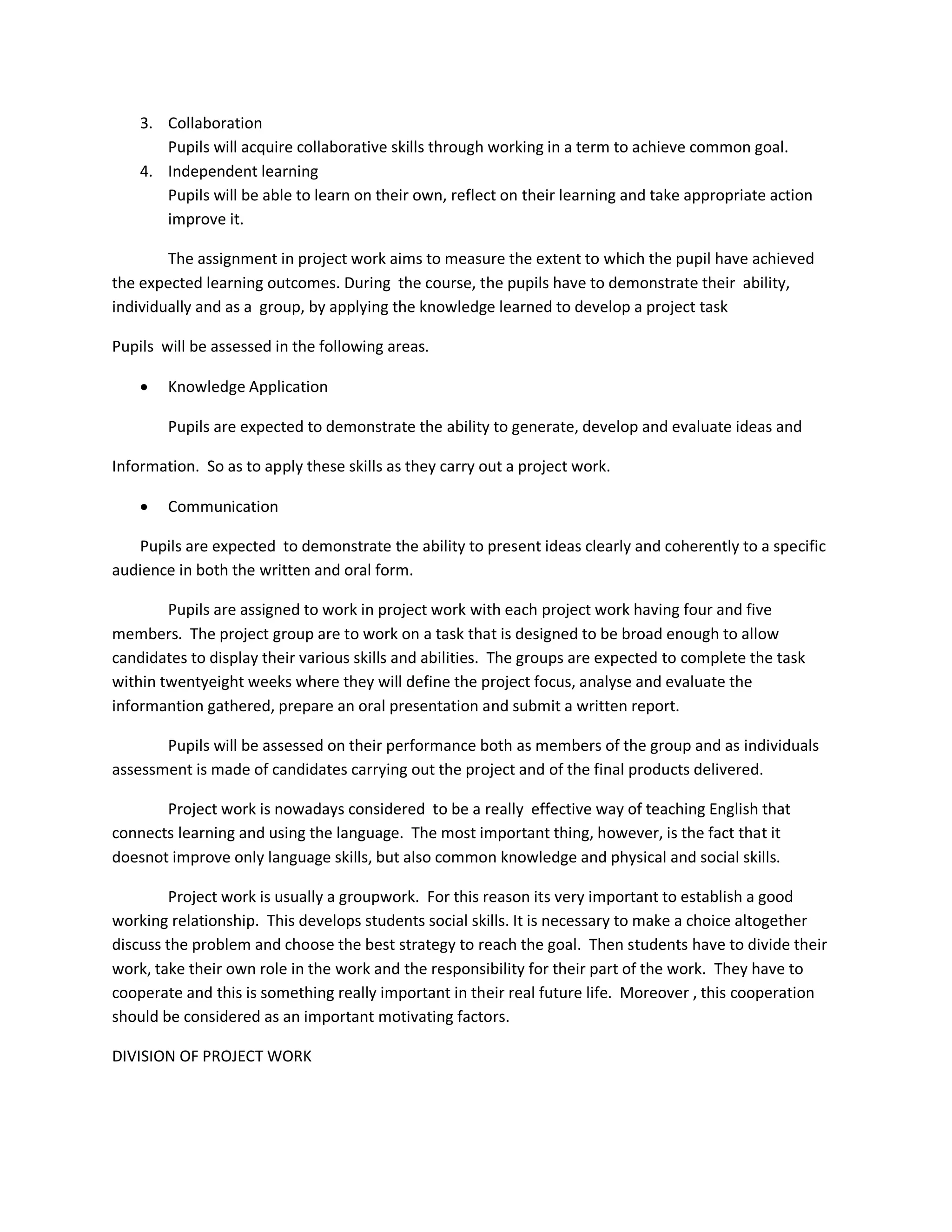 Project work allows students to study independently or in groups under a teacher's guidance. It involves activities that apply students' skills and knowledge to real-life situations. Project work improves various skills like collaboration, communication, and independent learning. Teachers play an important role in motivating students and guiding them through the different stages of a project. Project work is most commonly implemented in later school years once students have developed sufficient skills and knowledge.