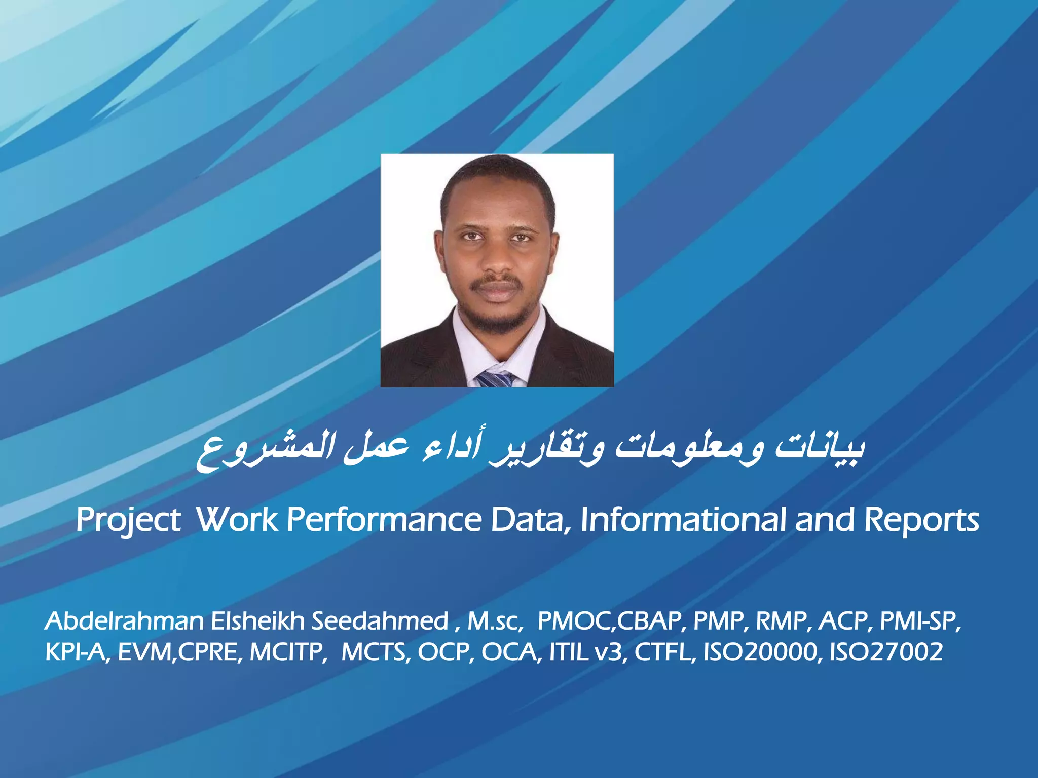 تتناول الوثيقة بيانات أداء العمل في المشاريع وتقاريرها ومعلوماتها، وتبرز أهمية إدارة الأعمال وتوجيه المشروع وضبط العمليات لمتابعة الأداء. تشمل الوثيقة مؤهلات وخبرات عبد الرحمن الشيخ في مجالات إدارة المشاريع والمراقبة والرقابة على الأداء. كما تُشير إلى أهمية استخدام البيانات من أجل تحسين المشاريع وتحقيق الأهداف المحددة.