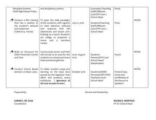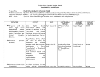 This document provides a project work plan and budget matrix for a Child Protection Policy at a school. The objectives are to create a safe learning environment and address irresponsible behavior by 45 out of 100 students. Activities include developing child rights policies, student profiling, orientations, a film viewing, building a child protection center and park, and seminars on basic laws. The activities will be conducted between April 2016 and October 2016. Most have budgets between P500-P5500 from MOOE funds to cover expenses like tarps, snacks, and certificates. The coordinator and school head are responsible for implementation.