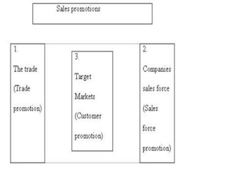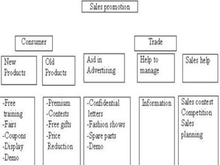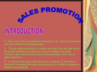 Sales promotion is a marketing technique used to temporarily increase sales. It includes tactics beyond advertising and personal selling like coupons, loyalty programs, and discounts. The goal is to stimulate immediate customer purchases or dealer effectiveness over a limited time period. Common sales promotion techniques provided as examples are price deals, loyal reward programs, cents-off deals, and coupons.