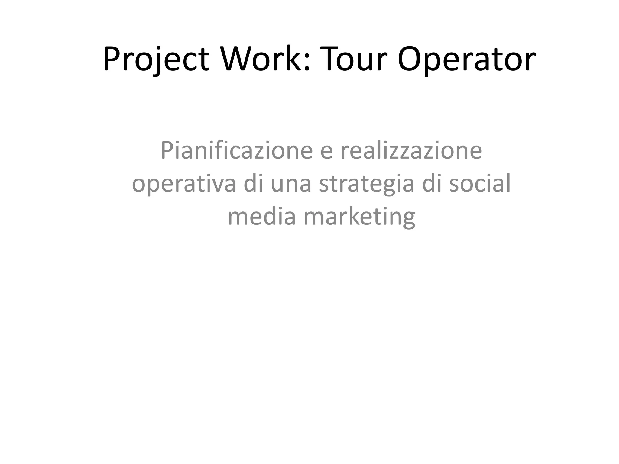 Il progetto si concentra sulla pianificazione e realizzazione di una strategia di social media marketing per un tour operator tradizionale che offre pacchetti vacanza mare. L'obiettivo è aumentare la brand awareness e la popolarità attraverso i social media, mirando a un incremento del traffico sul sito e alla disintermediazione verso il cliente finale. Il budget previsto è di 20.000 € e il target include famiglie, coppie e singoli di età compresa tra 25 e 70 anni.