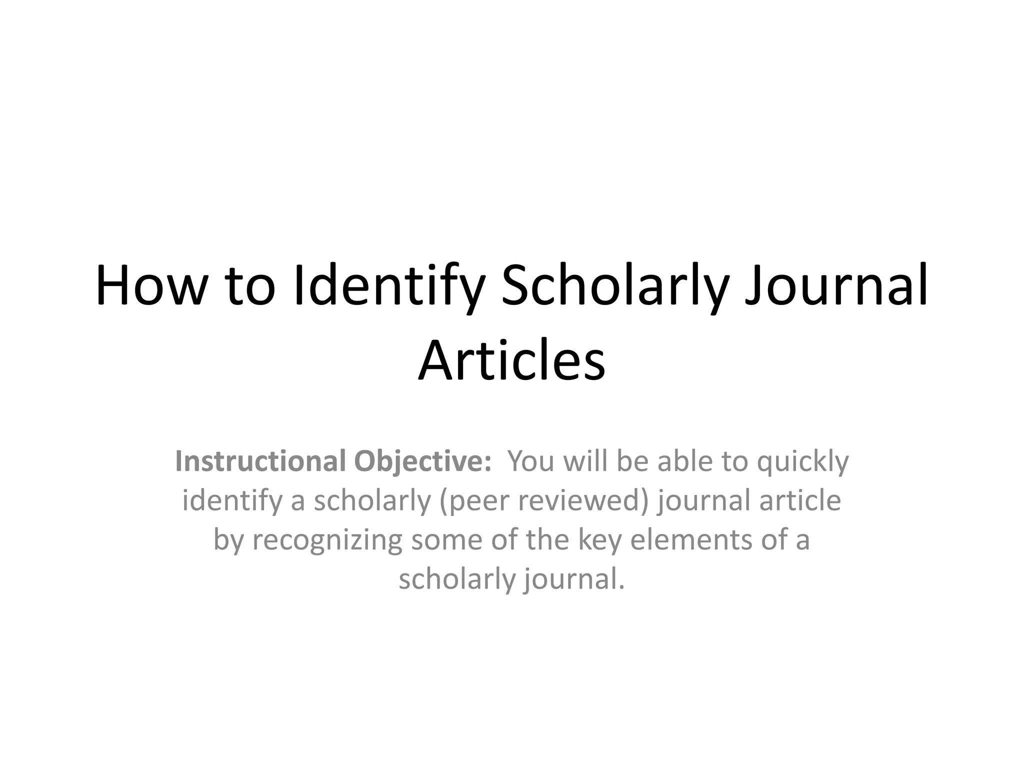 This document provides instruction on how to identify scholarly journal articles by recognizing key elements such as author affiliation with research institutions, the presence of an abstract written by the author to summarize the article, and a bibliography/reference list of cited sources. It notes that scholarly articles are peer-reviewed and written in a serious tone for researchers rather than a general audience. The document includes a quiz to test the reader's understanding of these identifying features of scholarly journal articles.