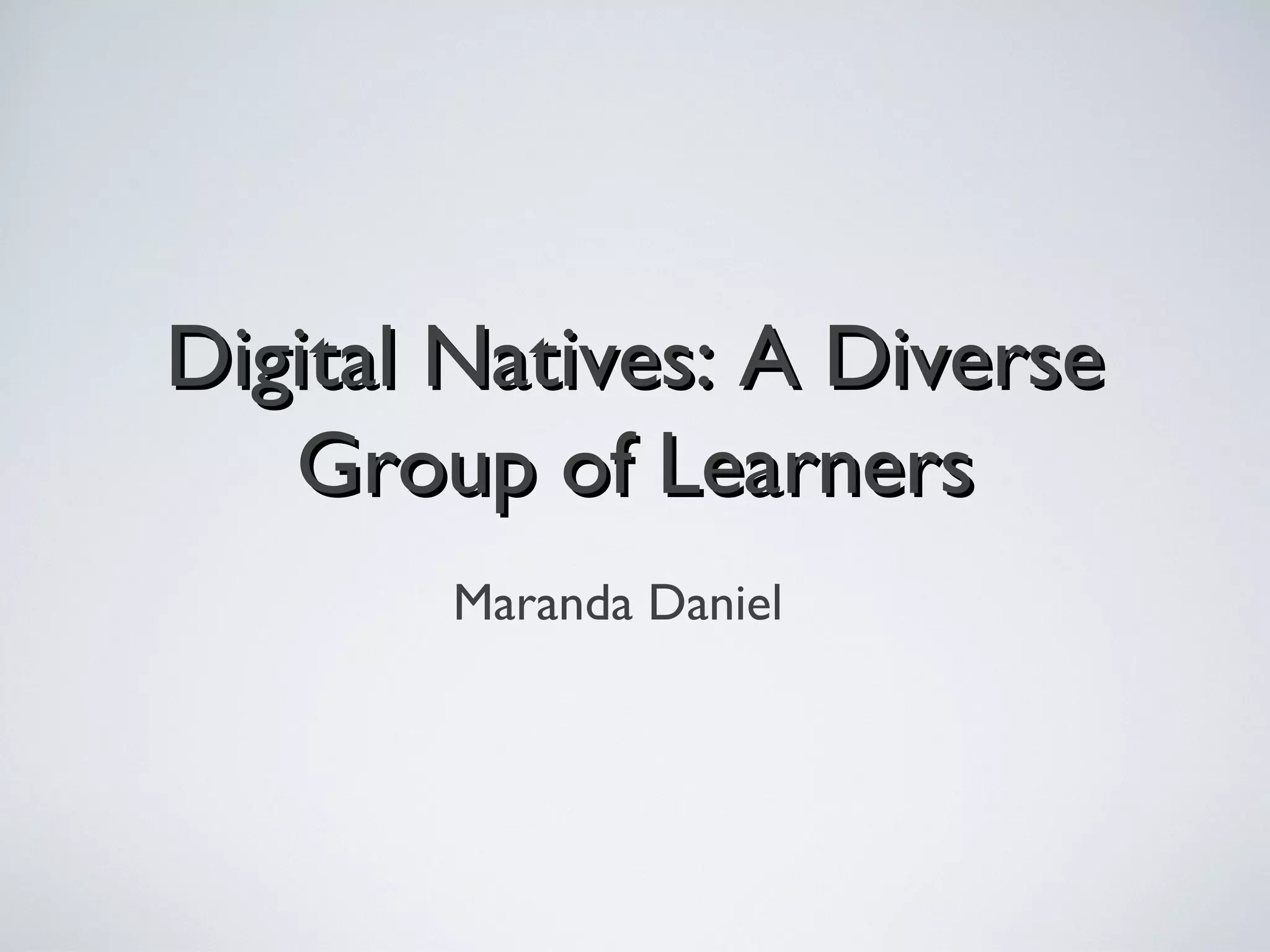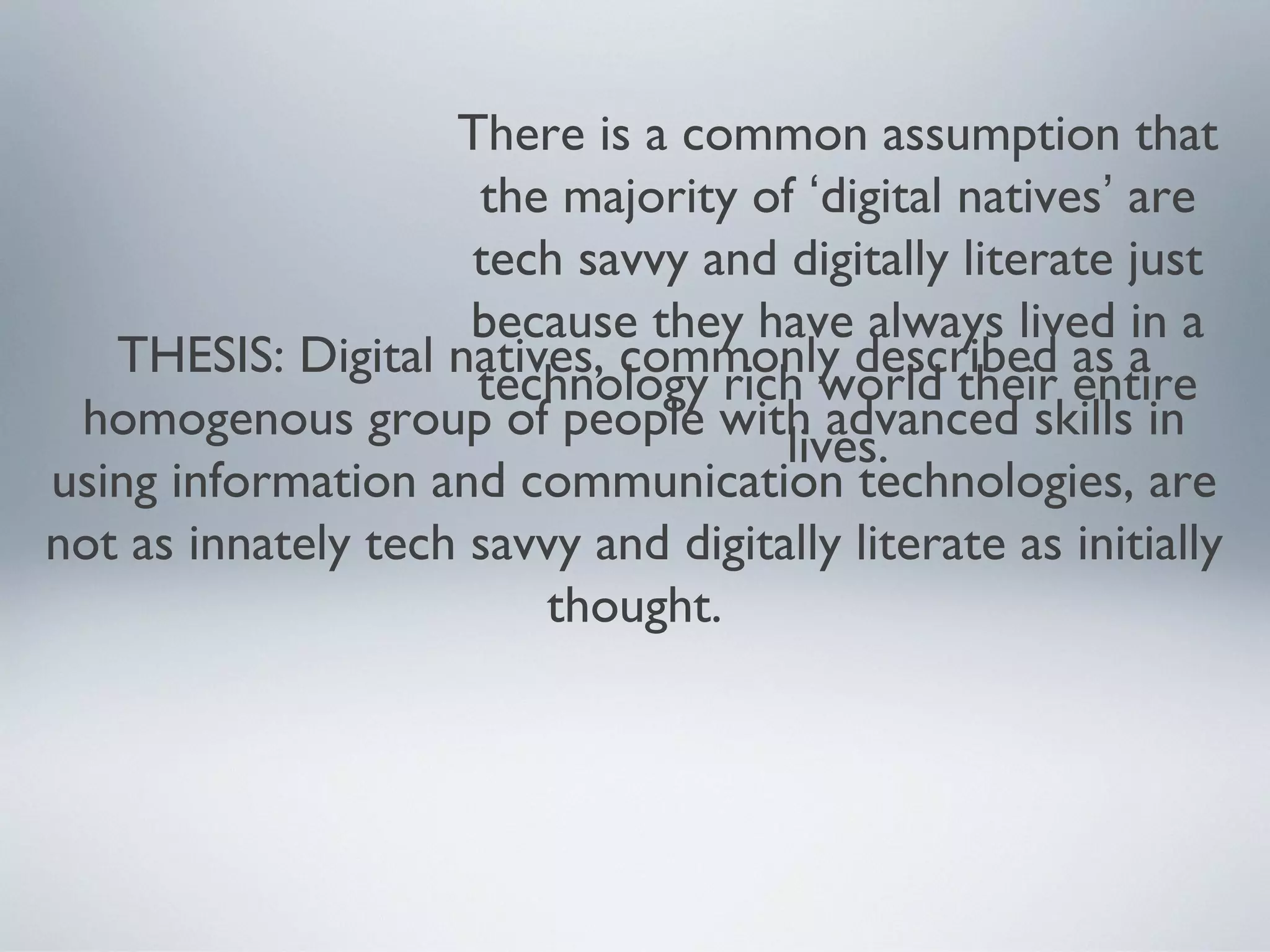 The document challenges the common assumption that all digital natives are equally tech savvy and digitally literate. It argues that while digital natives have grown up in a technology-rich world, research shows their skills with information and communication technologies (ICT) can vary due to factors like gender, socioeconomic status, and cultural background. Specifically, males and females tend to use ICT differently, access and abilities correlate with socioeconomic levels, and cultural upbringing influences ICT skills.