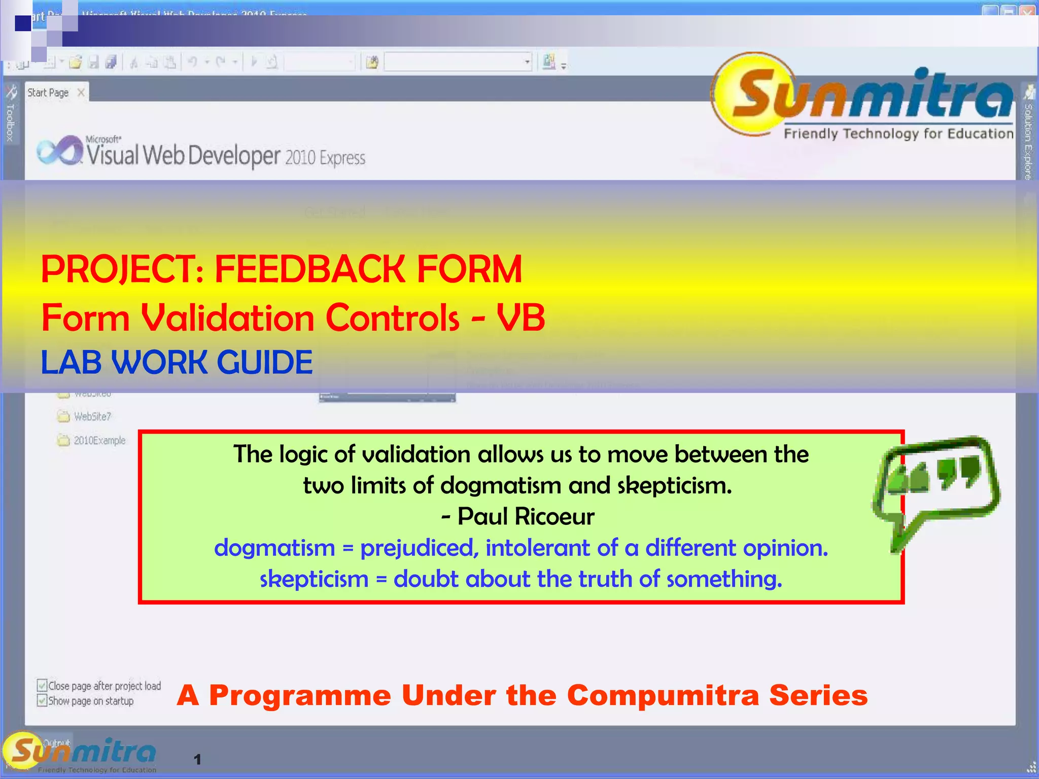 The goal is to walk through creating a sample feedback form project with validation controls to demonstrate form validation techniques in Visual Basic.