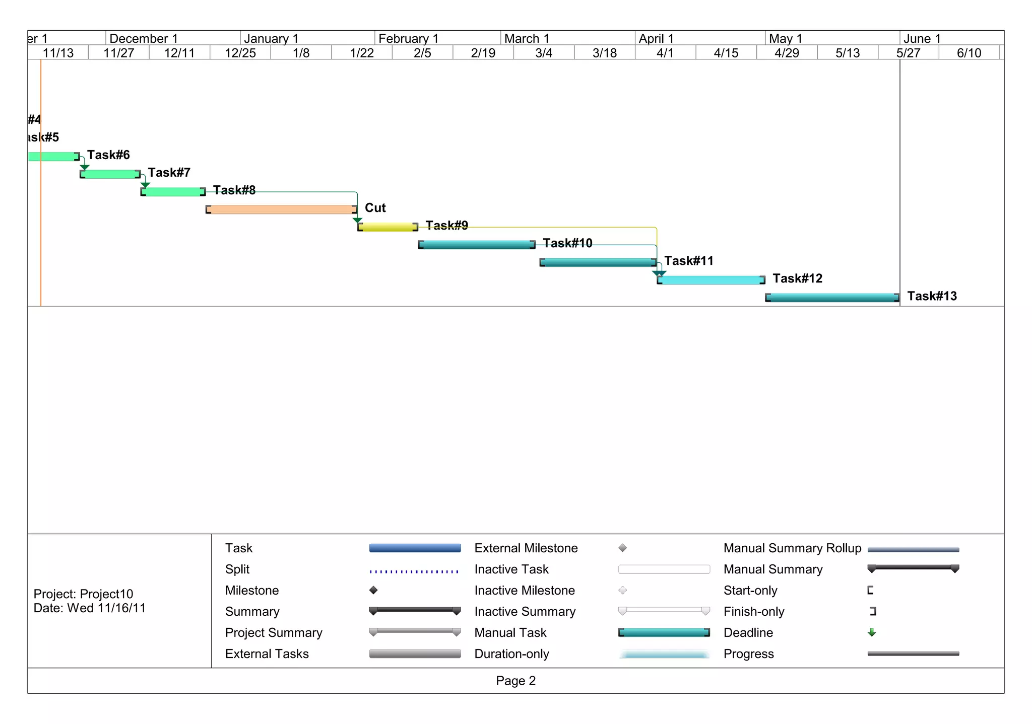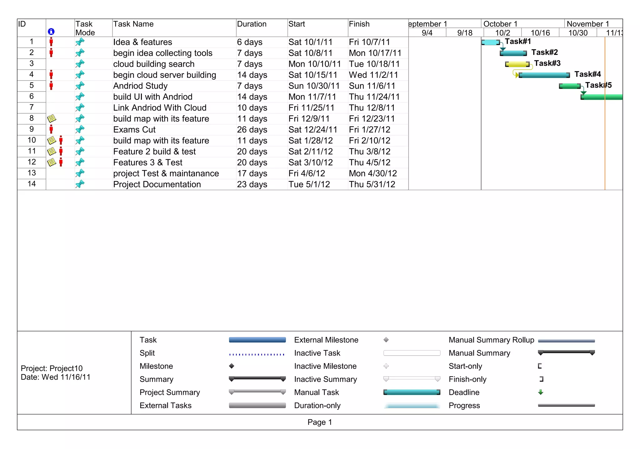 The document outlines a project schedule spanning from October 2011 to June 2012. It includes 14 tasks related to developing an Android and cloud-based application. Task 1 involves planning ideas and features from October 1-7. Subsequent tasks include collecting tools, building search capabilities, developing the Android and cloud components, linking them together, adding maps and features, testing, and documentation. The schedule shows expected start and finish dates for each task over the months.