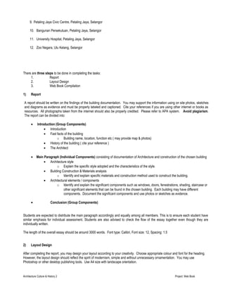 This document outlines the requirements for Project 2 of the Architecture Culture & History 2 course. Students will work in groups of 5 to research and document a modern architecture building in Klang Valley, Malaysia from the 20th century. They must write a report analyzing the building's style, construction, and components. They will then design a web book layout and compile the report and supporting materials into a digital publication. The final web book link is submitted for assessment based on the quality of content, organization, and design.