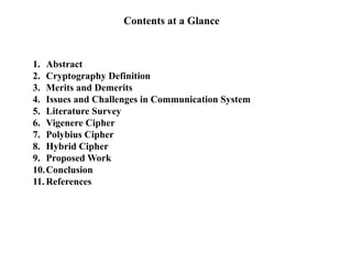 The document presents a cryptographic technique for secure communication, aiming to address issues like data privacy and security threats through the application of hybrid algorithms. It outlines methods such as the Vigenere and Polybius ciphers, and proposes a new encryption process combining these methods to enhance security against attacks. The conclusion emphasizes the need for ongoing research and development in cryptography to improve data protection.