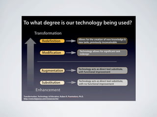 This document provides an overview of project-based learning (PBL). It discusses key elements of effective PBL projects, including ensuring they are authentic, academically rigorous, involve applied learning and active exploration. Projects should involve adult relationships and feedback. Assessment should be based on criteria involving student outcomes and reflection. The document also discusses using technology to enhance PBL and provides some PBL project examples. It concludes with suggestions for teachers to get started with PBL, such as becoming comfortable with rubrics and allowing student reflection and decision making.