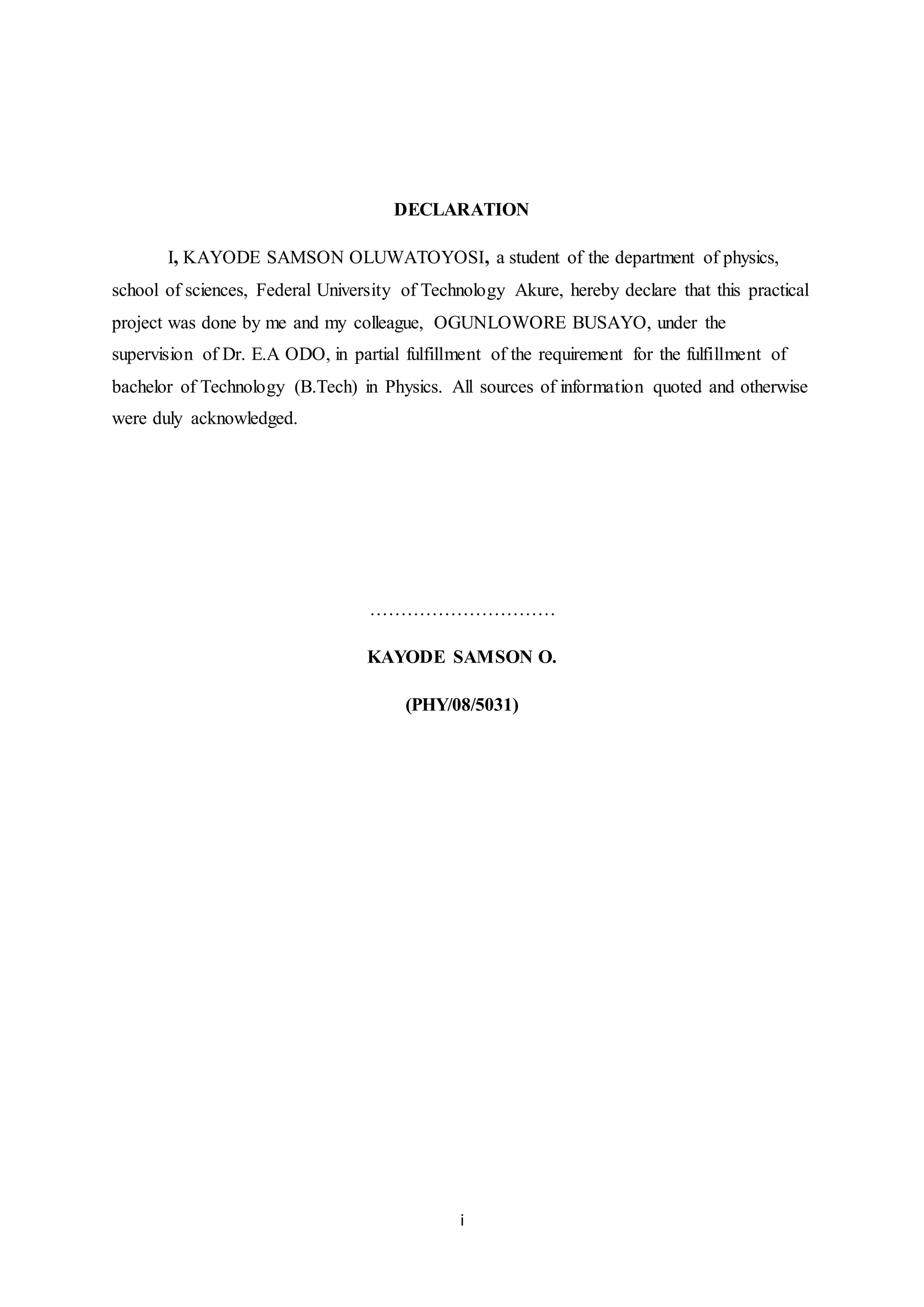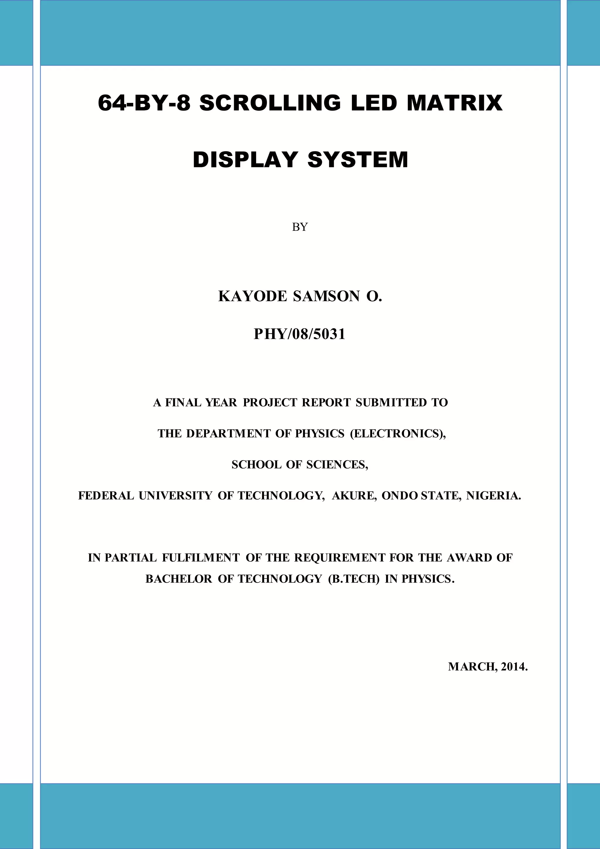 The document is a final year project report on the design and construction of a 64-by-8 scrolling LED matrix display system by Kayode Samson O., submitted to the Federal University of Technology, Akure. This project utilizes a PIC18F4520 microcontroller programmed in C to control the display of scrolling characters and is designed for cost efficiency and easy expansion. It details the implementation process, including hardware design, firmware development, and PCB fabrication, alongside acknowledgments and literature reviews related to microcontrollers and LED matrix displays.