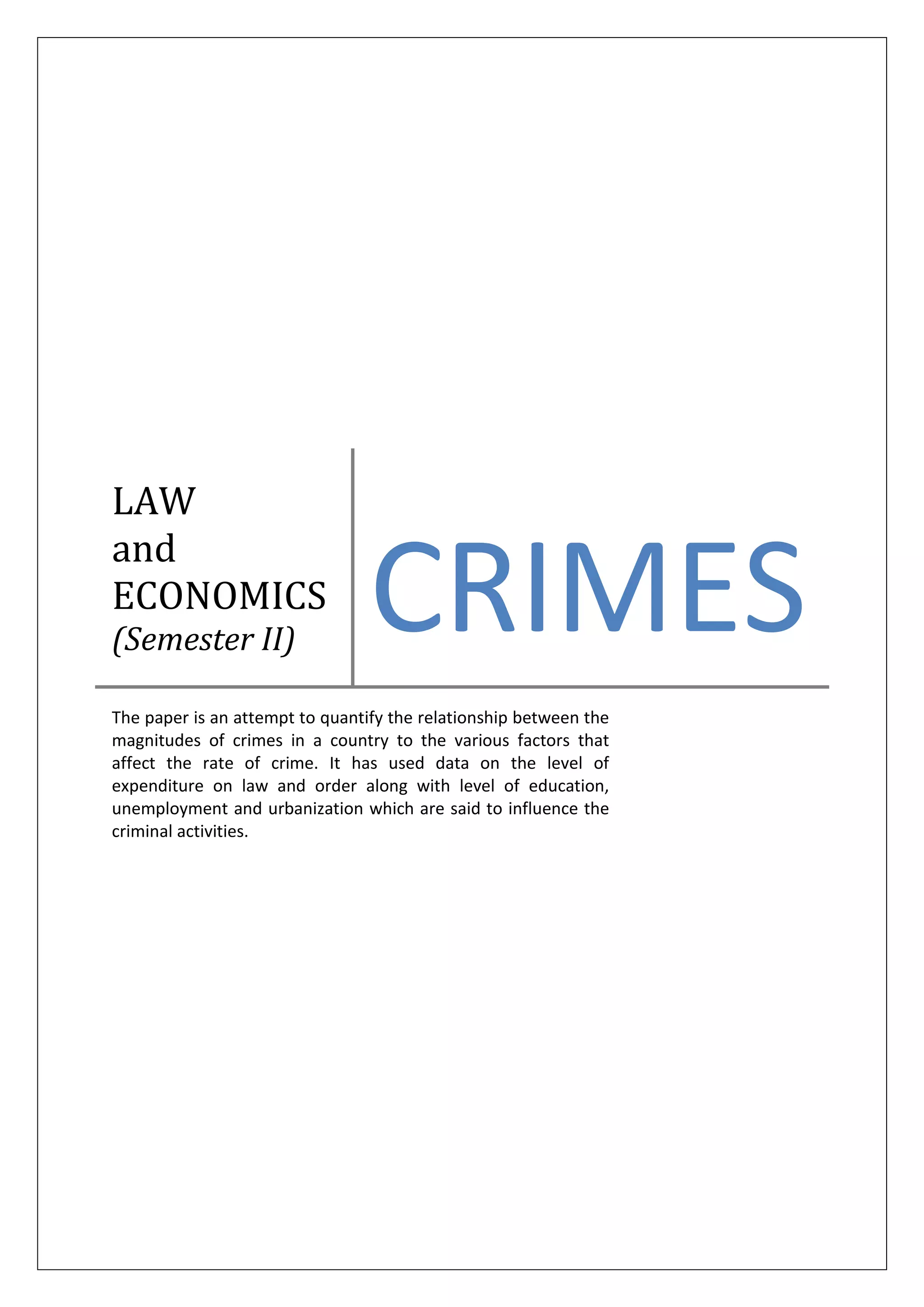 This document provides an overview of a paper analyzing the relationship between crime rates and socioeconomic factors. It contains an introduction discussing the concept of crime and factors influencing criminal activity. The document then outlines several sections analyzing the roots and economic factors related to crime, quantifying the relationship between crime and education, unemployment, urbanization, and law enforcement spending through regression analysis and examples of different countries. It concludes with remarks on policies for reducing crime.
