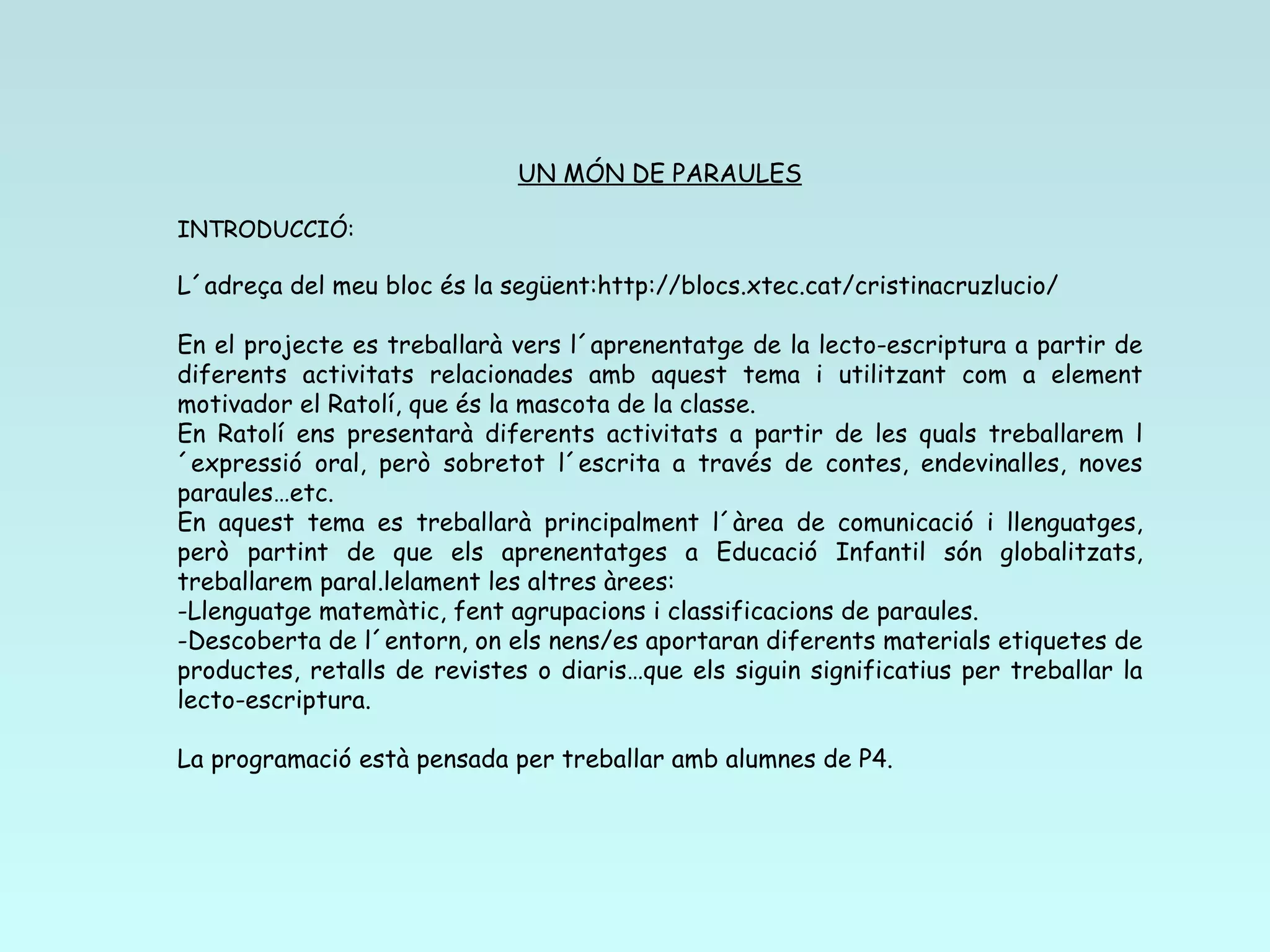 UN MÓN DEPARAULES INTRODUCCIÓ: L´adreça del meu bloc és la següent:http://blocs.xtec.cat/cristinacruzlucio/ En el projecte es treballarà vers l´aprenentatge de la lecto-escriptura a partir de diferents activitats relacionades amb aquest tema i utilitzant com a element motivador el Ratolí, que és la mascota de la classe. En Ratolí ens presentarà diferents activitats a partir de les quals treballarem l´expressió oral, però sobretot l´escrita a través de contes, endevinalles, noves paraules…etc. En aquest tema es treballarà principalment l´àrea de comunicació i llenguatges, però partint de que els aprenentatges a Educació Infantil són globalitzats, treballarem paral.lelament les altres àrees: -Llenguatge matemàtic, fent agrupacions i classificacions de paraules. -Descoberta de l´entorn, on els nens/es aportaran diferents materials etiquetes de productes, retalls de revistes o diaris…que els siguin significatius per treballar la lecto-escriptura. La programació està pensada per treballar amb alumnes de P4.