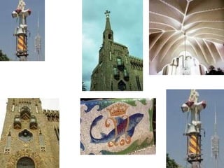 TORRE DE BELLESGUARD(1900 - 1909) Una casa, un palauet i un castell Els merlets i la torre que rematen aquesta casa ens recorden una fortificació medieval. Però l'austeritat i la duresa de l'aparença exterior, accentuada pel fet que Gaudí hi utilitzà materials extrets de l'entorn natural, contrasten amb l'amplitud i la lluminositat de l'interior, del qual també cal destacar els innovadors plantejaments estructurals de les golfes. La torre cònica és revestida de ceràmica vidriada, amb els colors de la bandera catalana que rememoren l'edifici de Martí I, últim rei de la corona d'Aragó, que antigament havia ocupat aquest terreny i del qual també manlleva el nom.