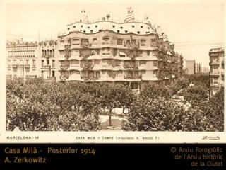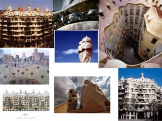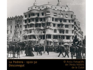 CASA MILÀ, LA PEDRERA (1906-1912) Viure en una escultura de pedra El senyor Pere Milà, que es casà amb una vídua rica, la senyora Roser Segimon, volia viure en una casa espectacular a l'avinguda més cosmopolita de la Barcelona de l'època: el passeig de Gràcia. Gaudí va ser l'arquitecte escollit, sobretot perquè acabava de construir la veïna Casa Batlló, considerada aleshores el darrer crit en l'arquitectura local. El senyor Milà, però, volia que la seva fos més gran: monumental. De manera que l'arquitecte hi construí dues finques amb accessos independents, però unificades per una mateixa façana, de pedra i ritmes ondulants, que disposa de grans finestrals que permeten una bona il·luminació interior. Una sorprenent estructura al soterrani que serví de garatge, una distribució en planta lliure als pisos que serviren d'habitatges i una particular golfa que suporta el terrat, en són els elements més significatius.