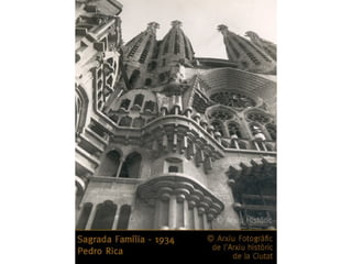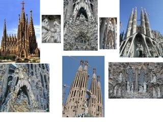 TEMPLE EXPIATORI DELA SAGRADA FAMILIA (1883-1926) Símbol d'una ciutat L'edifici més visitat de Barcelona i el que, sens dubte, identifica la ciutat arreu del món, és obra de Gaudí. El 1883, l'arquitecte acceptà de continuar un projecte de plantejament neogòtic ja començat, però el va refer totalment, amb vocació monumental i una decoració exuberant, i hi treballà fins a la seva mort, el 1926. Hi aplicà, d'una manera original, formes de la geometria reglada. Paraboloides hiperbòlics, voltes convexes, helicoides i hiperboloides són només una breu referència de la complexitat de tota l'estructura, que recull l'essència dels coneixements i l'experiència constructiva de Gaudí. Tots els elements del temple, els arquitectònics i els ornamentals, posen de manifest una voluntat simbòlica procedent de la tradició cristiana.