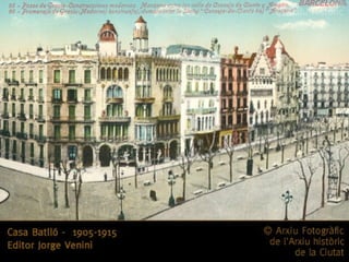 CASA BATLLÓ (1904-1906) La metamorfosi d'un edifici El geni de Gaudí transformà una casa entre mitgeres, típica de l'Eixample del segle XIX, en un dels edificis més singulars de l'arquitectura de Barcelona: la Casa Batlló. Gaudí va fer-hi una reforma integral. A la façana va afegir una tribuna, nous balcons i ceràmica policromada. A l'interior va reorganitzar els espais i va unificar els patis i l'escala preexistent, per tal d'aconseguir-hi més il·luminació i ventilació. Va completar aquesta intervenció afegint-hi dues plantes, que rematà amb un coronament ceràmic espectacular.