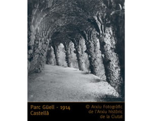 PARC GÜELL (1900-1914) Visió utòpica del paradís perdut El parc Güell és el somni fet realitat d'un empresari emprenedor, Eusebi Güell, i d'un arquitecte revolucionari que, a partir del model anglès de les ciutats- jardí, es van proposar transformar una extensa finca del nord de Barcelona, rocosa i plena de desnivells, en una zona residencial. Malgrat l'aparença feréstega del parc, tot en ell va ser pensat: els accessos, el mercat, la plaça major, els desguassos, les cisternes, els camins, les escales, les tanques ... i encara que la primera guerra mundial va fer fracassar aquesta operació immobiliària, l'estat en que va quedar el projecte ens permet conèixer el Gaudí urbanista, el defensor de la natura, el creador d'escenaris bucòlics, el que experimentava noves tècniques constructives i el que s'inspirava en la cultura popular. Un parc que reflecteix les seves idees de simbiosi entre l'home i la natura.