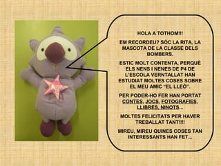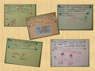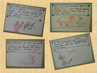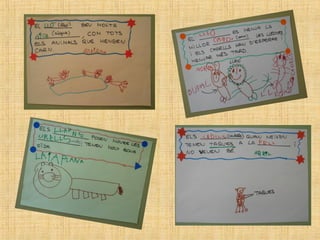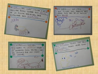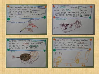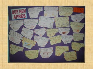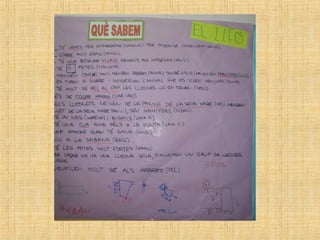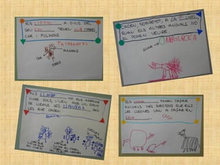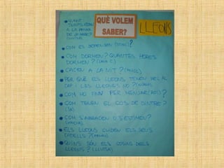 The students in class P4 at the Escola Verntallat have been learning about lions. They brought in books, toys, photos and more to share what they learned. Some of the key facts they discussed about lions include: lions hunt in prides led by females, they have strong claws and teeth for hunting, males have manes, they live in the savannah and are carnivores that eat zebras, nyus, and other animals. The students also asked questions to further their understanding of things like how lions care for their cubs, communicate, and defend themselves.