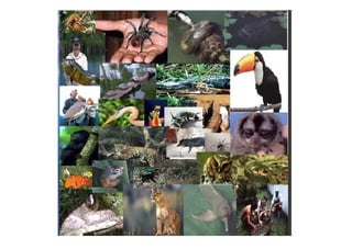 The document describes several animals found in the Amazon rainforest, including the pink dolphin, caiman, jaguar, toucan, piranha, and titi monkey. It provides details about each animal's physical characteristics, diet, and behavior.