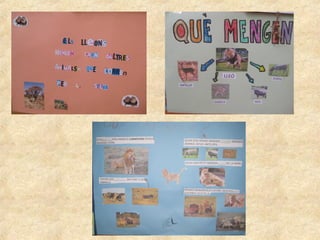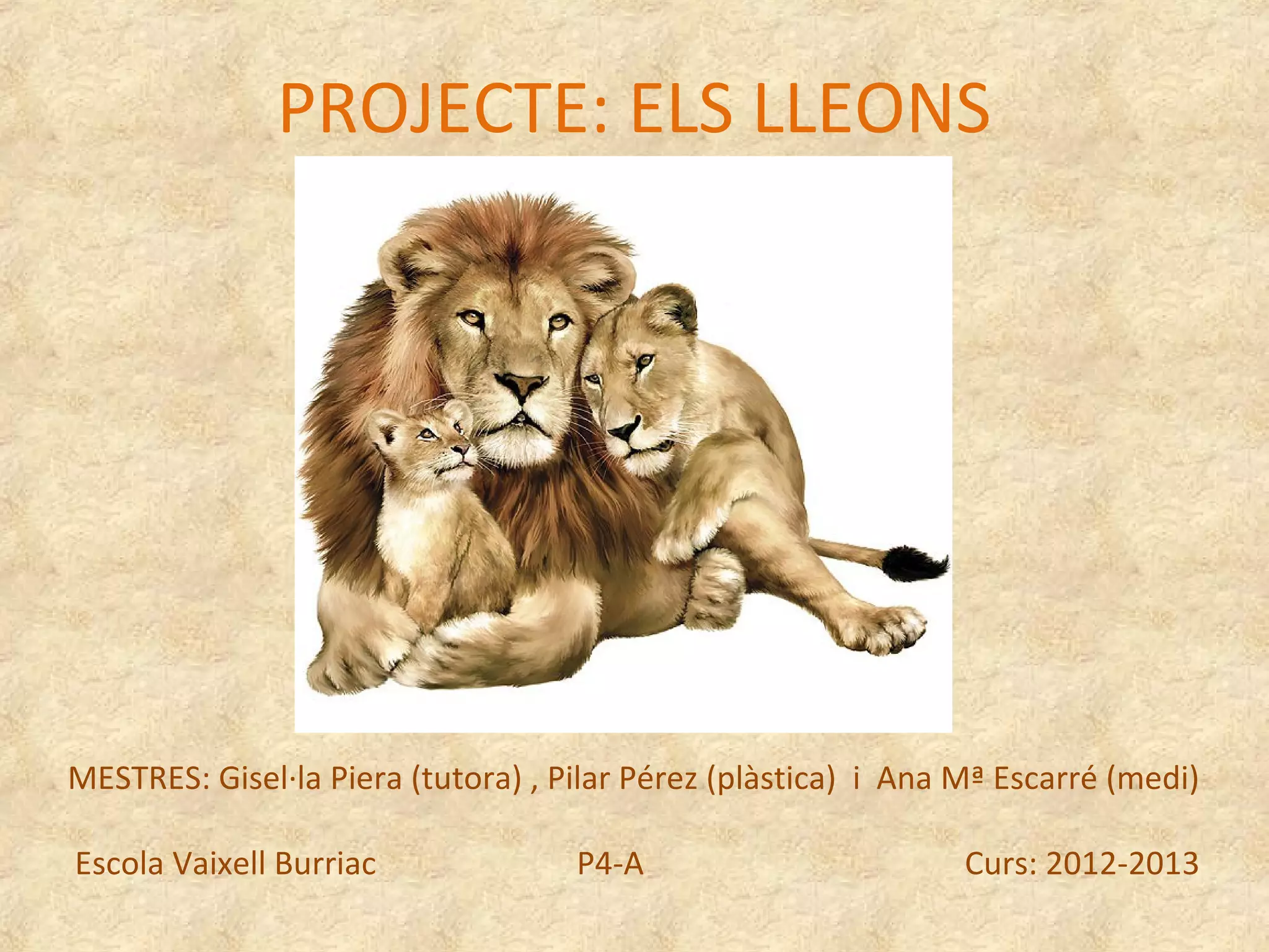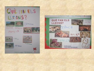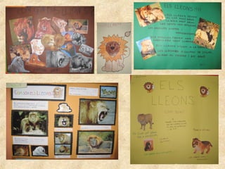 The document is a project about lions done by students in the 2012-2013 school year. It contains questions the students had about lions, as well as information they learned. They learned lions can weigh up to 200 kg by weighing themselves. They visited the zoo in Barcelona and did a workshop on big cats. The project includes the students' work showing what lions look like, what they eat, where they live, and activities they did in school like watching documentaries.