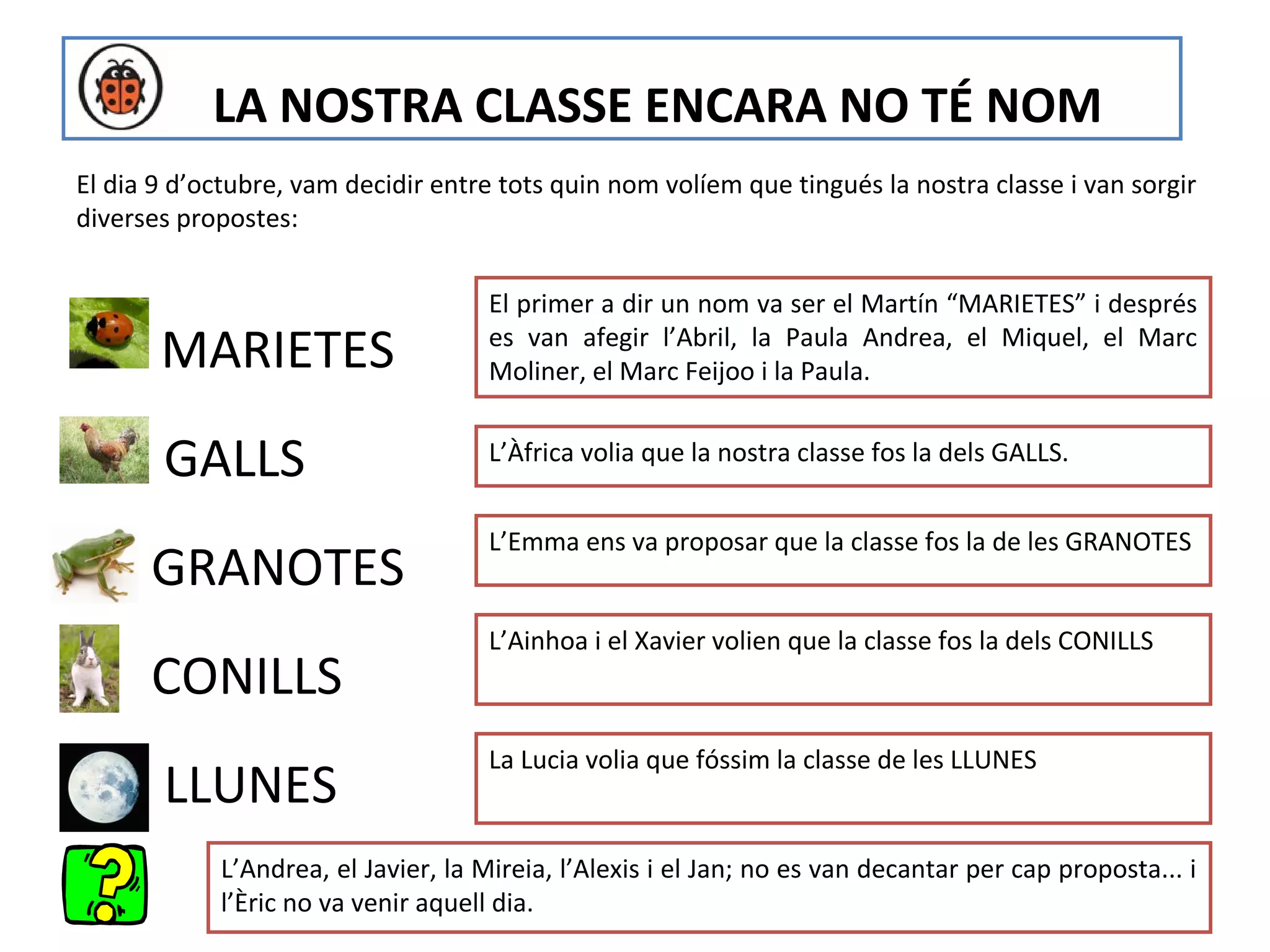 El dia 9 d’octubre, vam decidir entre tots quin nom volíem que tingués la nostra classe i van sorgir