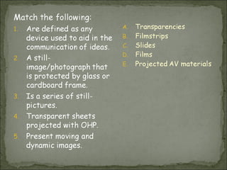 This document discusses different types of audiovisual library materials including books, movies, slides, filmstrips, transparencies, and motion pictures. It provides details on each format such as size, how they are used, benefits like being educational and motivating, and limitations such as lacking sound or being hard to preserve. The overall message is that while some older formats like slides and filmstrips are less popular now, libraries still collect them for their valuable educational information.