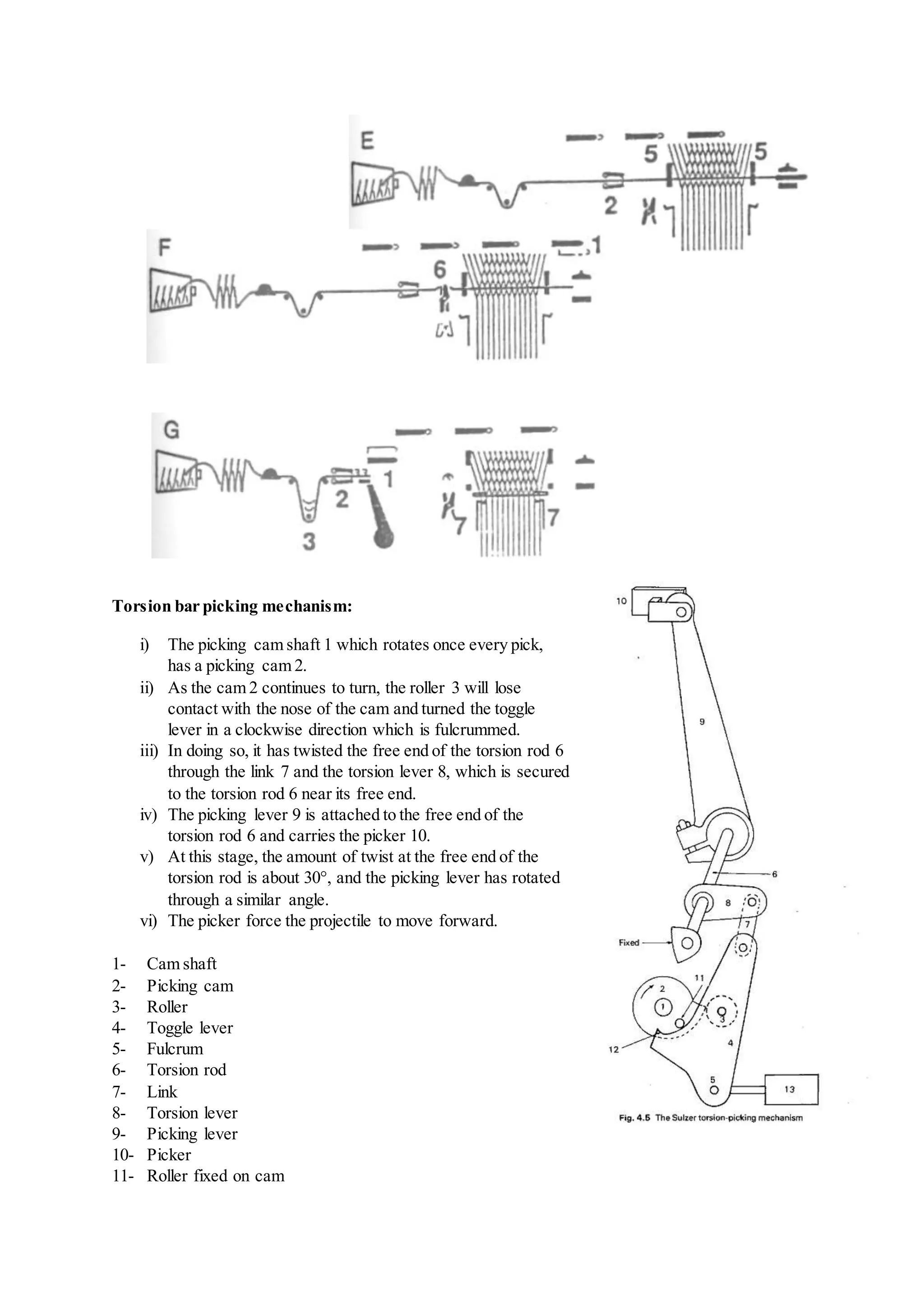 The document discusses different types of looms and their weft insertion mechanisms, including projectile looms, rapier looms, air jet looms, and multiphase looms. It describes the torsion bar picking mechanism of projectile looms and covers topics like weft insertion, selvedges, classifications of double rapier looms, air treatment systems for air jet looms, and calculations for fabric and yarn production.
