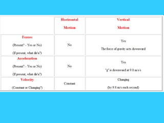 2) A projectile moves horizontally with constant velocity while being accelerated vertically by gravity. This results in a curved parabolic trajectory.