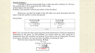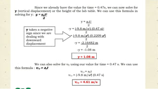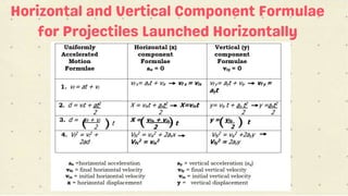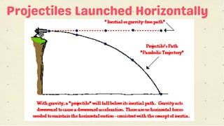 This document discusses projectile motion. It defines a projectile as any object that is thrown or dropped and is only influenced by gravity. Projectiles have both horizontal and vertical motion, but these motions are independent. Projectiles launched horizontally have no initial vertical velocity and only experience downward acceleration due to gravity. The motion of horizontally launched projectiles can be modeled using the uniformly accelerated motion equations for the horizontal and vertical components separately.