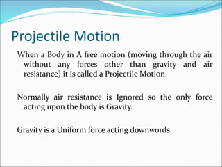 This document discusses projectile motion and presents information on various related topics. It describes projectile motion as the free motion of an object under the influence of gravity alone. The document notes that projectile motion can be horizontal, vertical, or parabolic depending on the forces acting on the object. Key factors that affect projectile motion are the initial velocity and launch angle. Equations for the horizontal and vertical components of projectile motion are presented. The maximum height, range, and time of flight of a projectile are defined. Horizontal and vertical projectile motion are examined separately, with the horizontal velocity remaining constant.