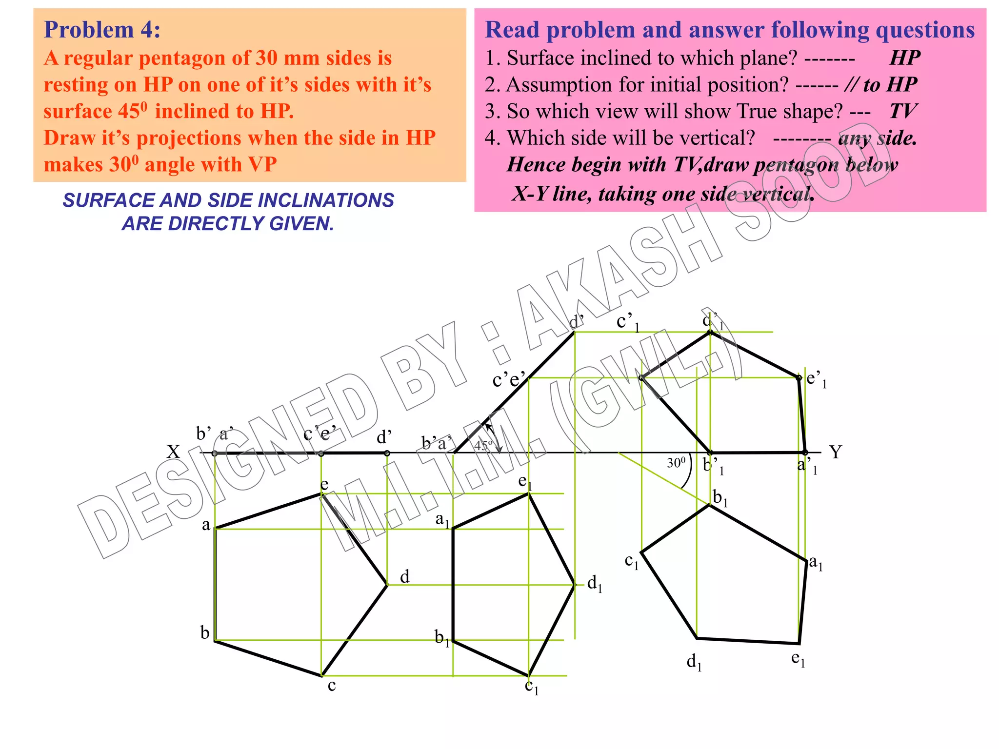 2) The problem asks to draw the projections of the pentagon when that side makes a 30 degree angle to the vertical plane (VP).