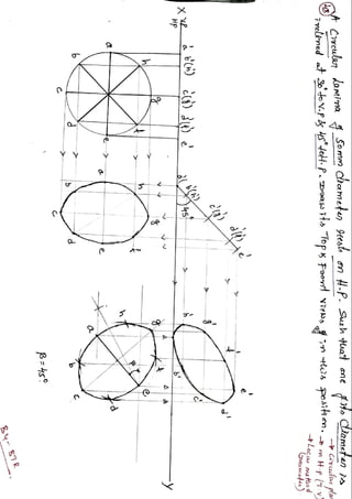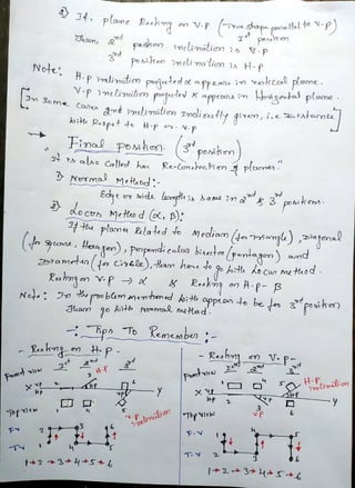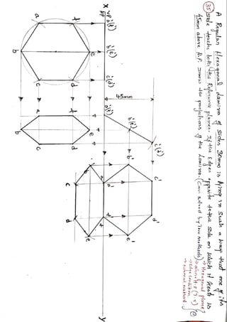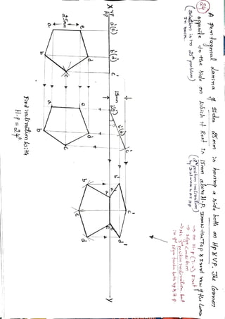 This document contains 44 problems involving drawing multi-view projections of triangular, rectangular, pentagonal, and hexagonal plane laminae in different orientations relative to reference planes (HP and VP). Each problem provides the shape and dimensions of the lamina, how it is positioned relative to the reference planes, and any other relevant information. The corresponding solutions provide top, front, and sometimes left side view drawings of the lamina(e) based on the given information in each problem.