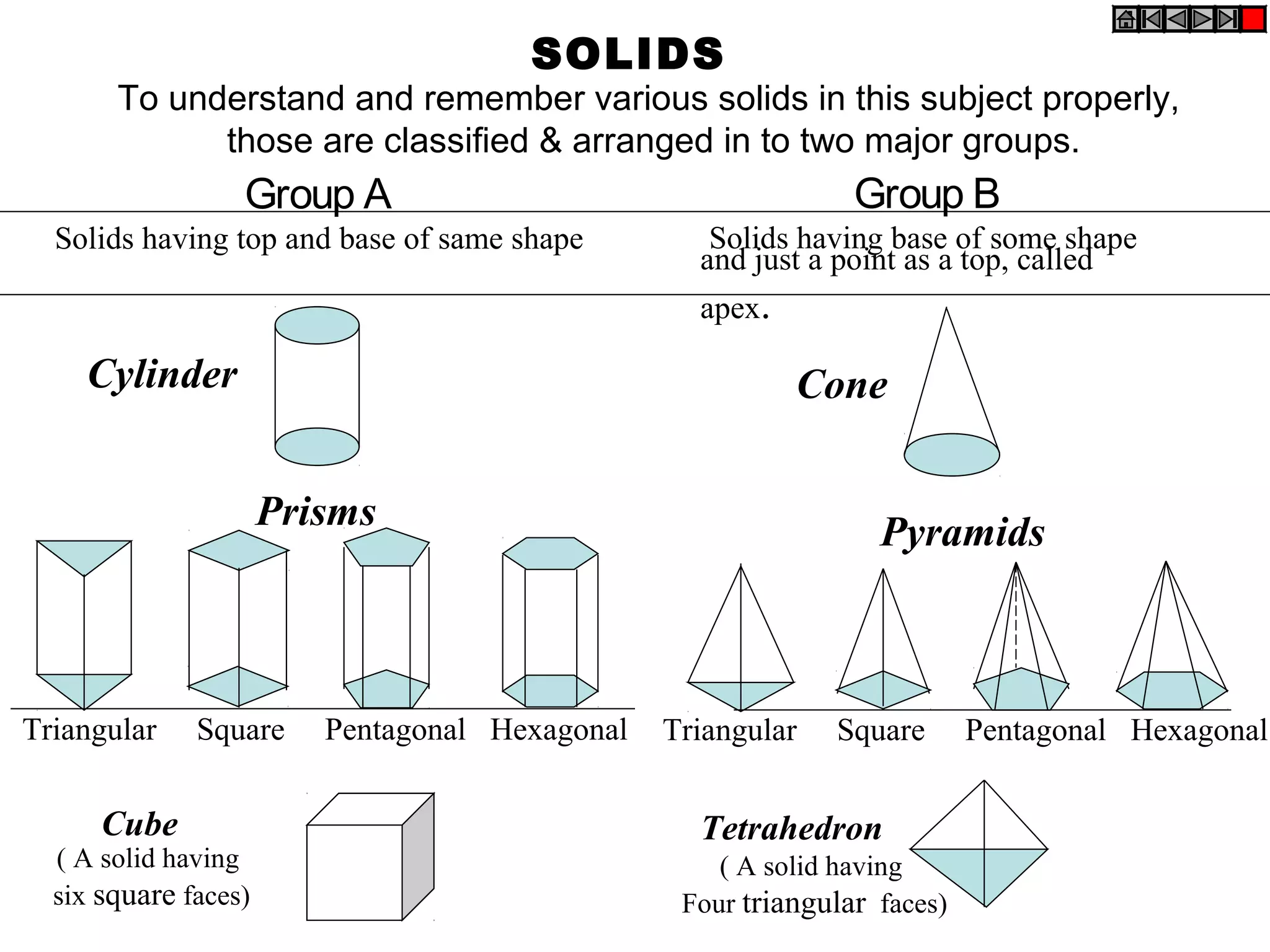 Section one classifies solids into two groups - Group A solids have the same shape for the top and base, such as prisms and cylinders. Group B solids have the base of one shape and a point top called the apex, such as pyramids and cones. It then provides examples and diagrams of different solids.