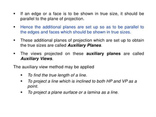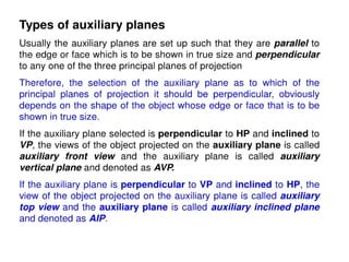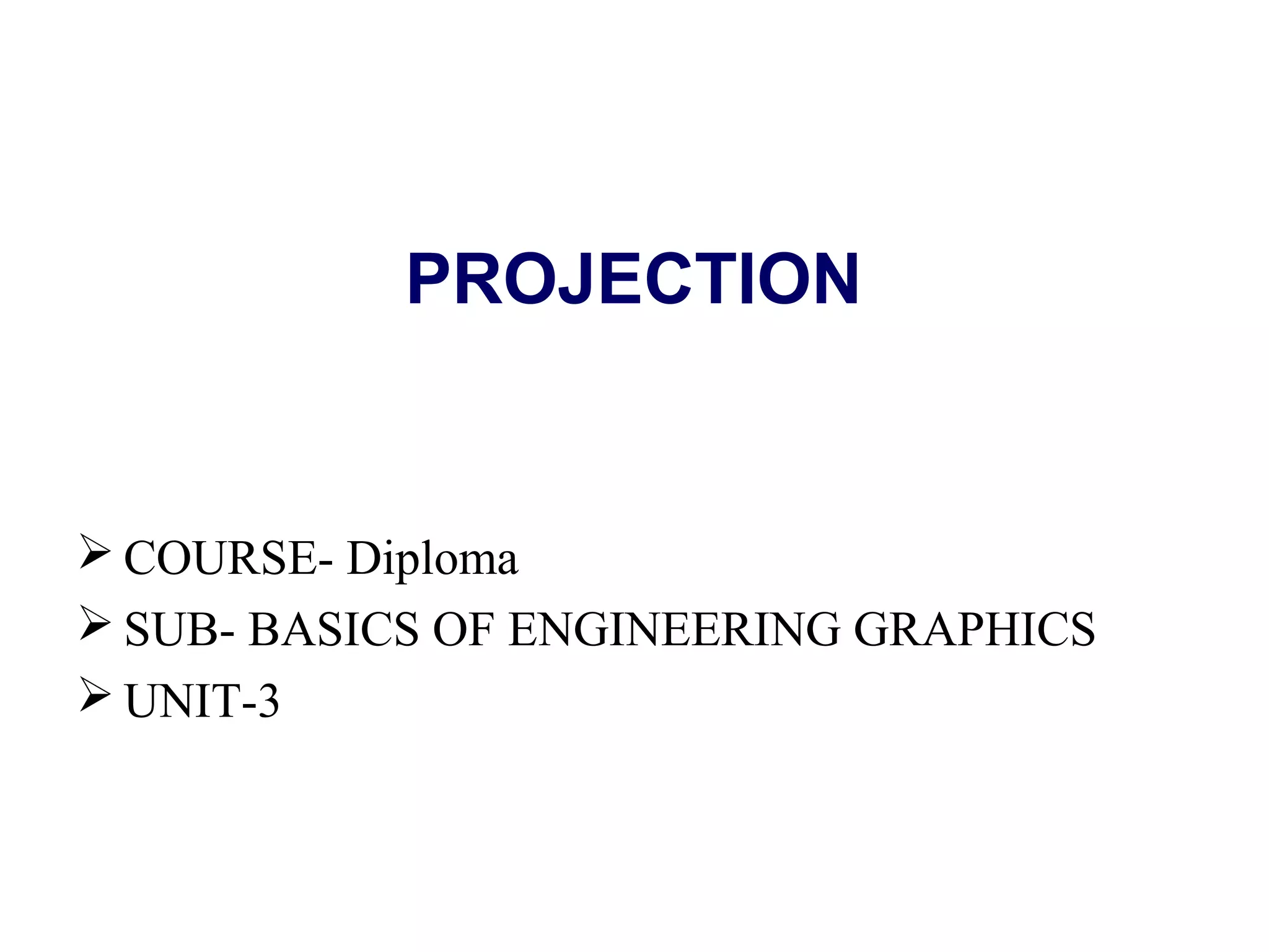 The document discusses orthographic projections and projections of solids. It defines orthographic projections as a method of representing the shape of a 3D object on a 2D surface using multiple views. It describes the principal planes used - horizontal plane, vertical frontal plane, and profile plane. It also discusses the first angle and third angle methods of projection. The document then defines different types of solids like polyhedra and solids of revolution. It describes various polyhedra like prisms, pyramids, and their types. It also defines solids of revolution like cylinders, cones, spheres. Important terms used in projections of solids like edges, generators, apex, and axis are also explained.