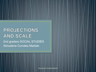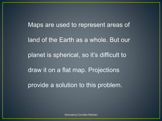 Maps represent the spherical Earth on a flat surface, which requires projections that distort the globe's shape. Projections display the globe using planar, cylindrical, or conic shapes to flatten it. Scale relates distances on a map to actual distances, shown numerically as a ratio or linearly with a divided line. Numerical scale gives the fraction comparing map units to land units, while linear scale directly measures map distances.