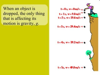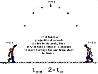 The document discusses the motion of projectiles fired at an angle. It explains that a projectile has both vertical and horizontal motion, with the vertical motion identical to if thrown straight up, undergoing acceleration from gravity. The horizontal motion is unaffected by gravity and maintains a constant velocity. The document provides an example of a ball thrown at a 60 degree angle, calculating its initial vertical velocity as 43 m/s and horizontal velocity as 25 m/s.