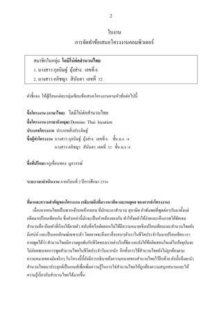 เทคโนโลยีสารสนเทศและการสื อสาร # ปี การศึกษา ''# ชือ โดมิโน่ ต่อสํ านวนไทย ชือผูทาโครงงาน ้ ํ ,. นางสาว กุลนิษฐ์ มุงส่ าง เลขที 6 ชั2น ม.# ห้อง 3 ้ . นางสาว อภิชญา สิ นนตา เลขที ชั2น ม.# ห้อง 3 ั ชืออาจารย์ทีปรึ กษาโครงงาน ครู เขือนทอง มูลวรรณ์ ระยะเวลาดําเนินงาน ภาคเรี ยนที ปี การศึกษา ''# โรงเรี ยนยุพราชวิทยาลัย จังหวัดเชียงใหม่ สํานักงานเขตพื2นทีการศึกษามัธยมศึกษาเขต 3