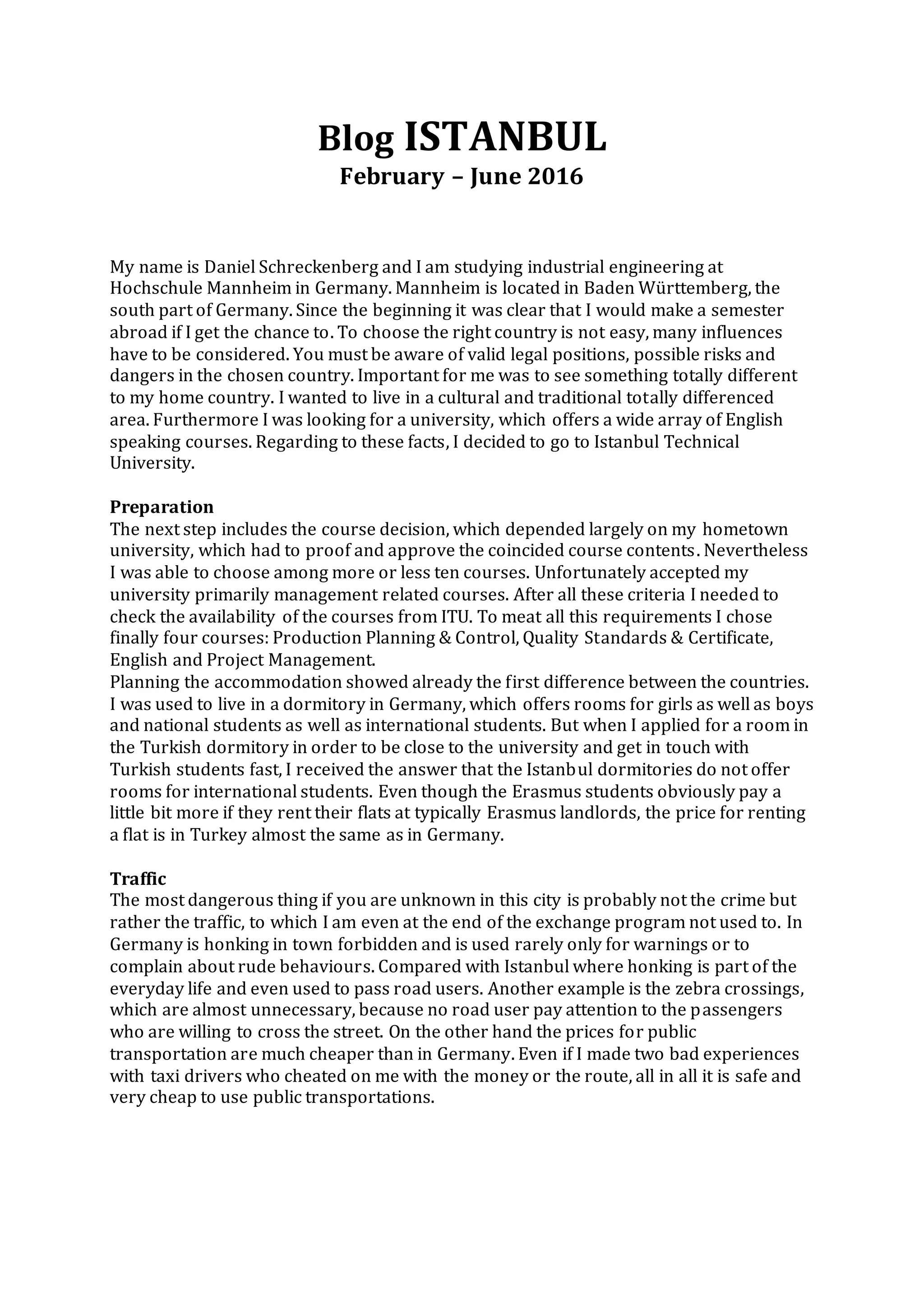 Daniel Schreckenberg, a German industrial engineering student, spent a semester abroad in Istanbul, Turkey. He chose Istanbul to experience a culture very different from Germany's. During his time there, he took Turkish language and engineering courses at Istanbul Technical University. He also explored Istanbul's sights, culture, and cuisine, going on day trips outside the city as well. Daniel found Turkish people to be very warm and family-oriented. While he missed some aspects of German culture, his semester abroad provided an unforgettable experience that expanded his horizons.