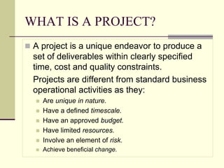 The document discusses project management and planning. It defines a project as a unique endeavor with defined time, cost and quality constraints. Projects differ from standard operations in being unique, time-bound, and involving risk. The document outlines why projects fail or succeed, and defines project management. It discusses the project life cycle of initiation, planning, execution, and closure. Key aspects of planning include organizing the team, developing project plans using techniques like Gantt charts and critical path analysis, and evaluating options using a planning cycle.
