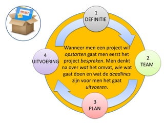 Men begint met de definitie en gaat zo verder. Dit kan natuurlijk niet in de andere volgorde. Wanneer alles goed besproken is en iedereen heeft een idee van het doel, het resultaat wat de opdrachten zijn, enzoverder kan het project van start gaan. Dat hebben wij ook gedaan.